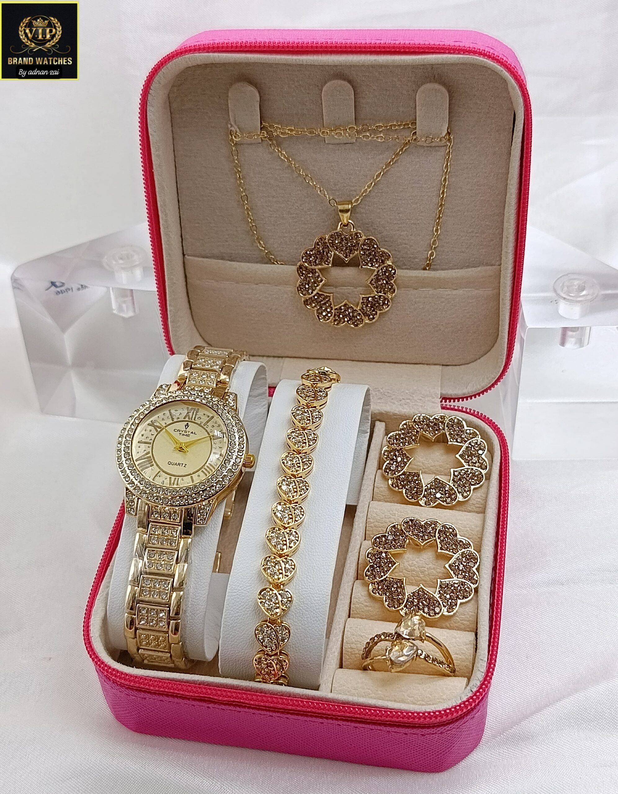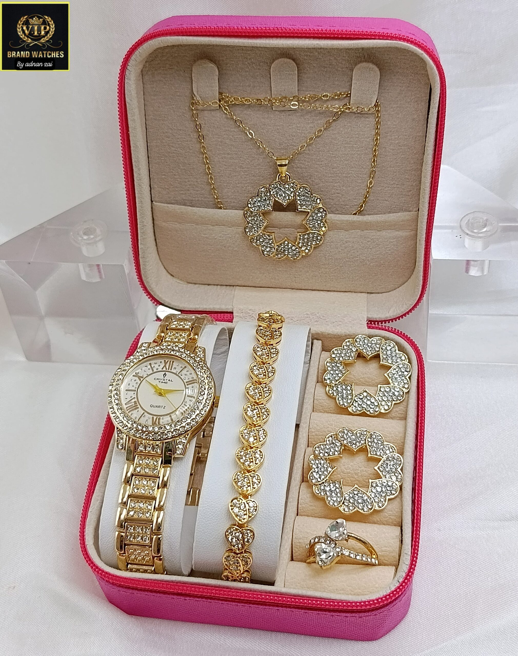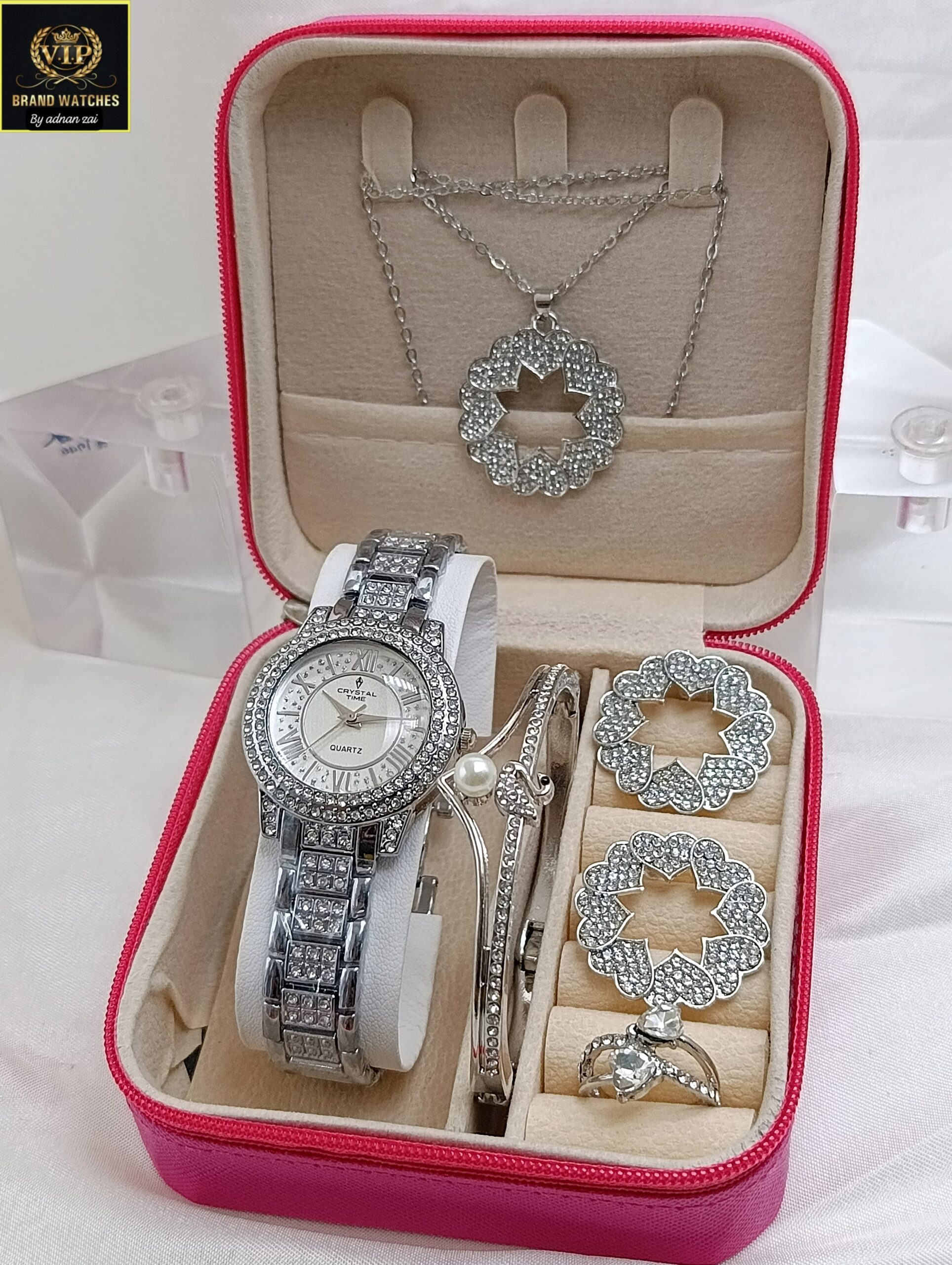 Indulge in the radiant sparkle of Crystal Girl’s exquisite jewelry collection. This complete set features a stunning watch with a diamond dial and chain, a matching diamond locket chain, elegant diamond earrings, and a captivating diamond ring. Elevate your style further with our Zircon stone diamond bracelet. Each piece is crafted to perfection, ensuring you shine brighter than ever. Presented in a beautiful gift box, it’s the perfect treat for yourself or a loved one. Discover timeless elegance and unparalleled brilliance with Crystal Girl