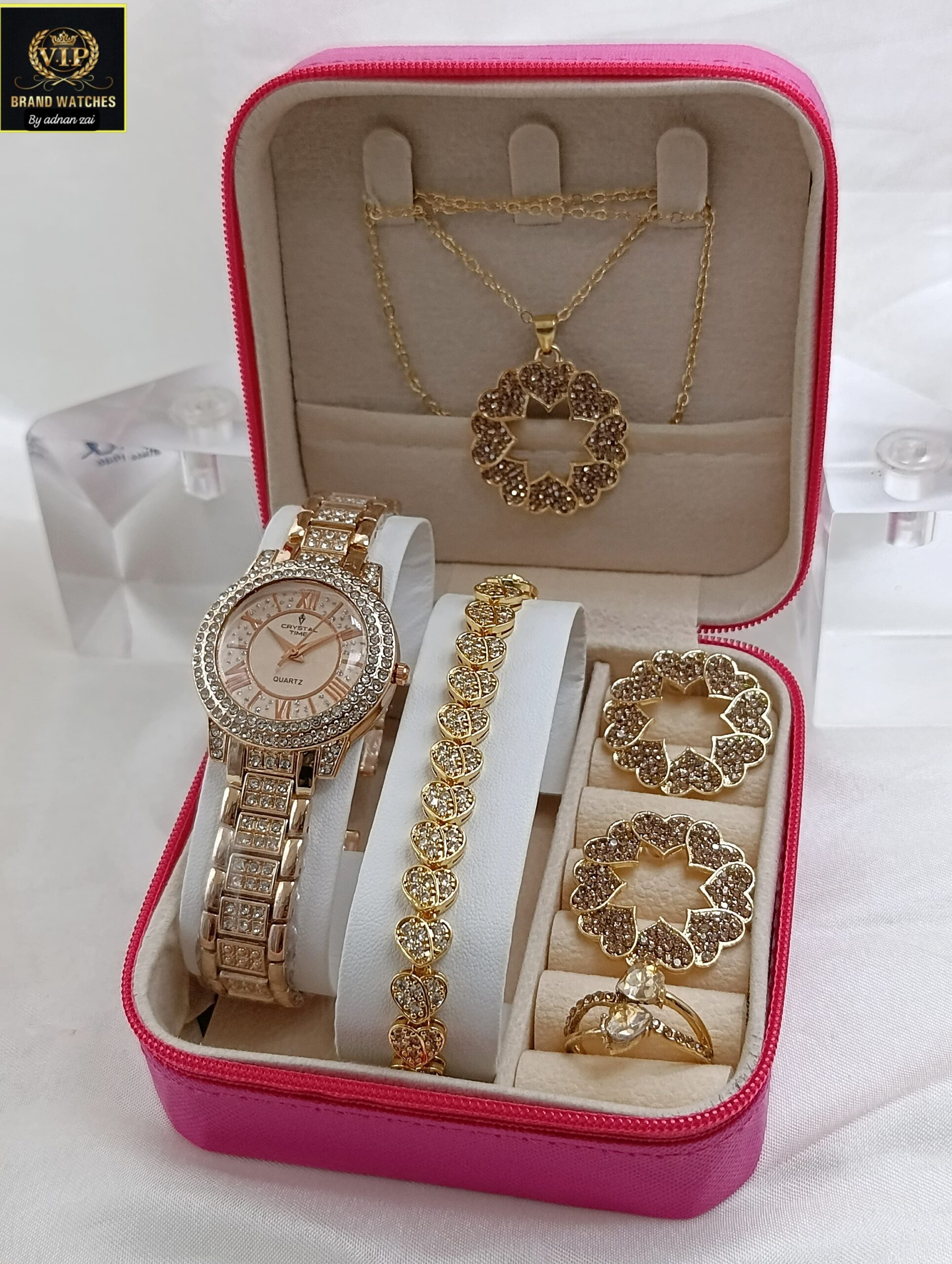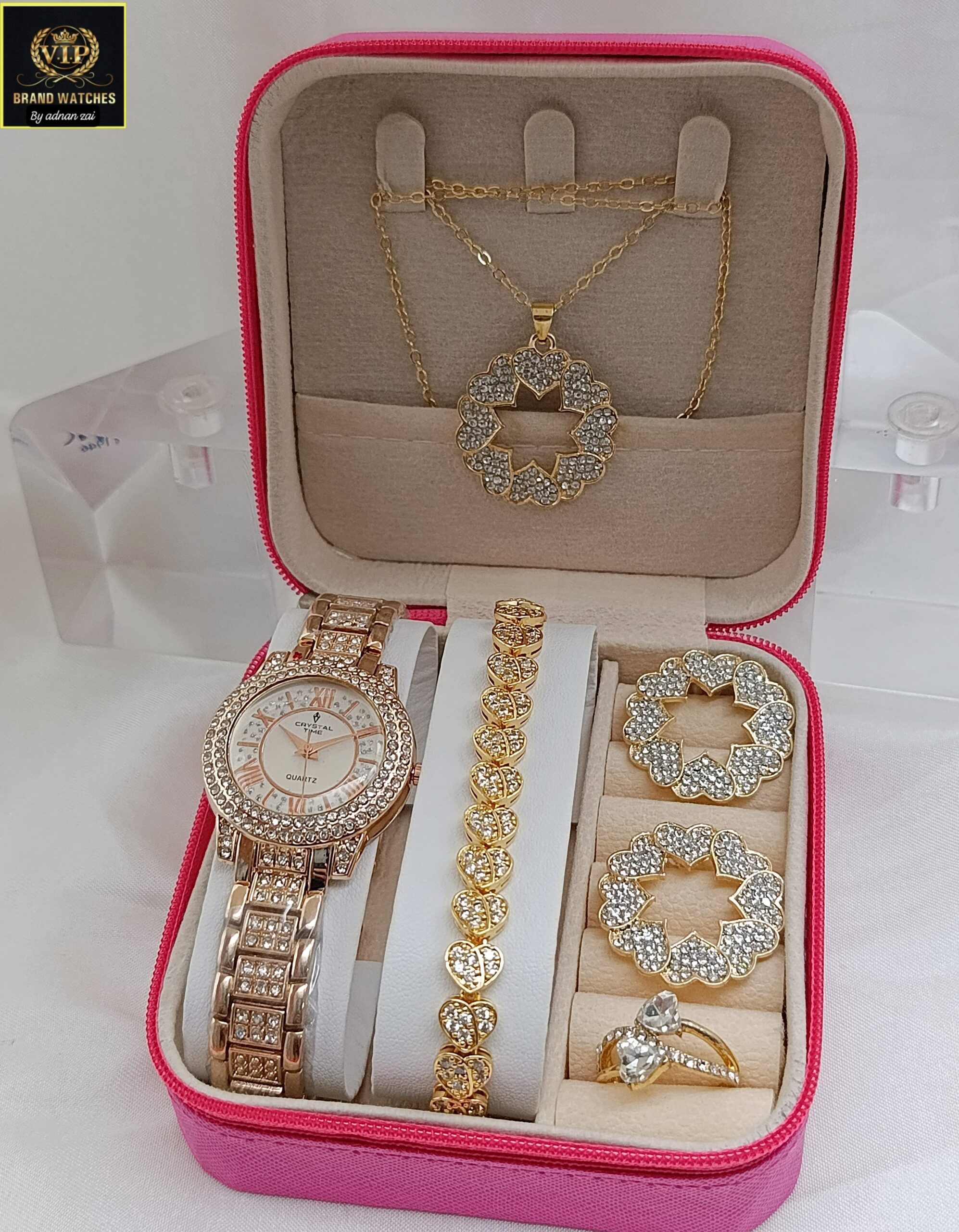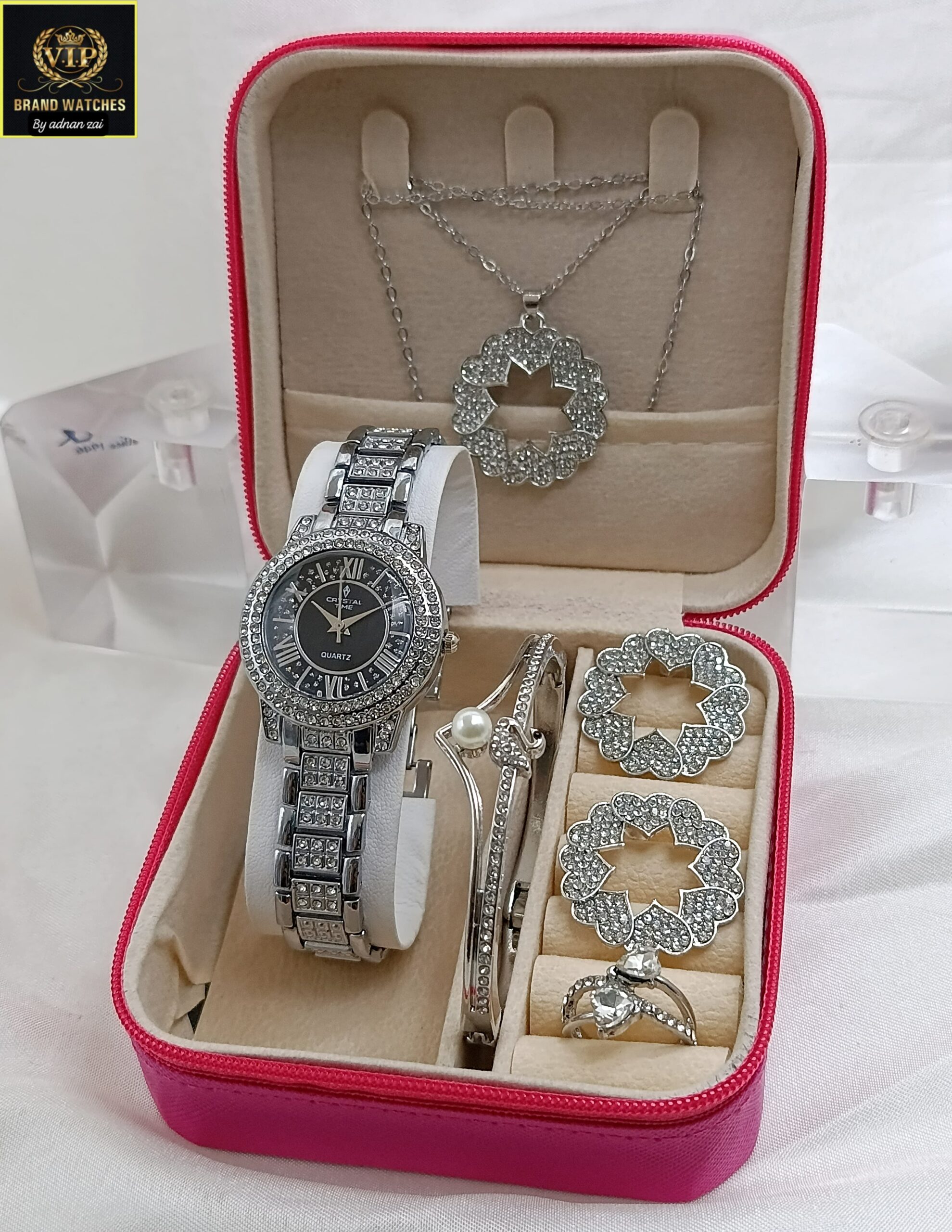 Indulge in the radiant sparkle of Crystal Girl’s exquisite jewelry collection. This complete set features a stunning watch with a diamond dial and chain, a matching diamond locket chain, elegant diamond earrings, and a captivating diamond ring. Elevate your style further with our Zircon stone diamond bracelet. Each piece is crafted to perfection, ensuring you shine brighter than ever. Presented in a beautiful gift box, it’s the perfect treat for yourself or a loved one. Discover timeless elegance and unparalleled brilliance with Crystal Girl