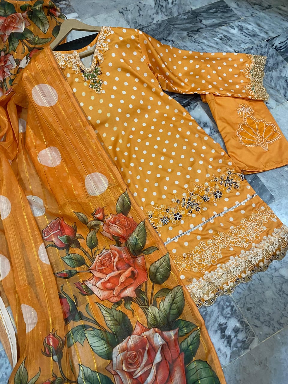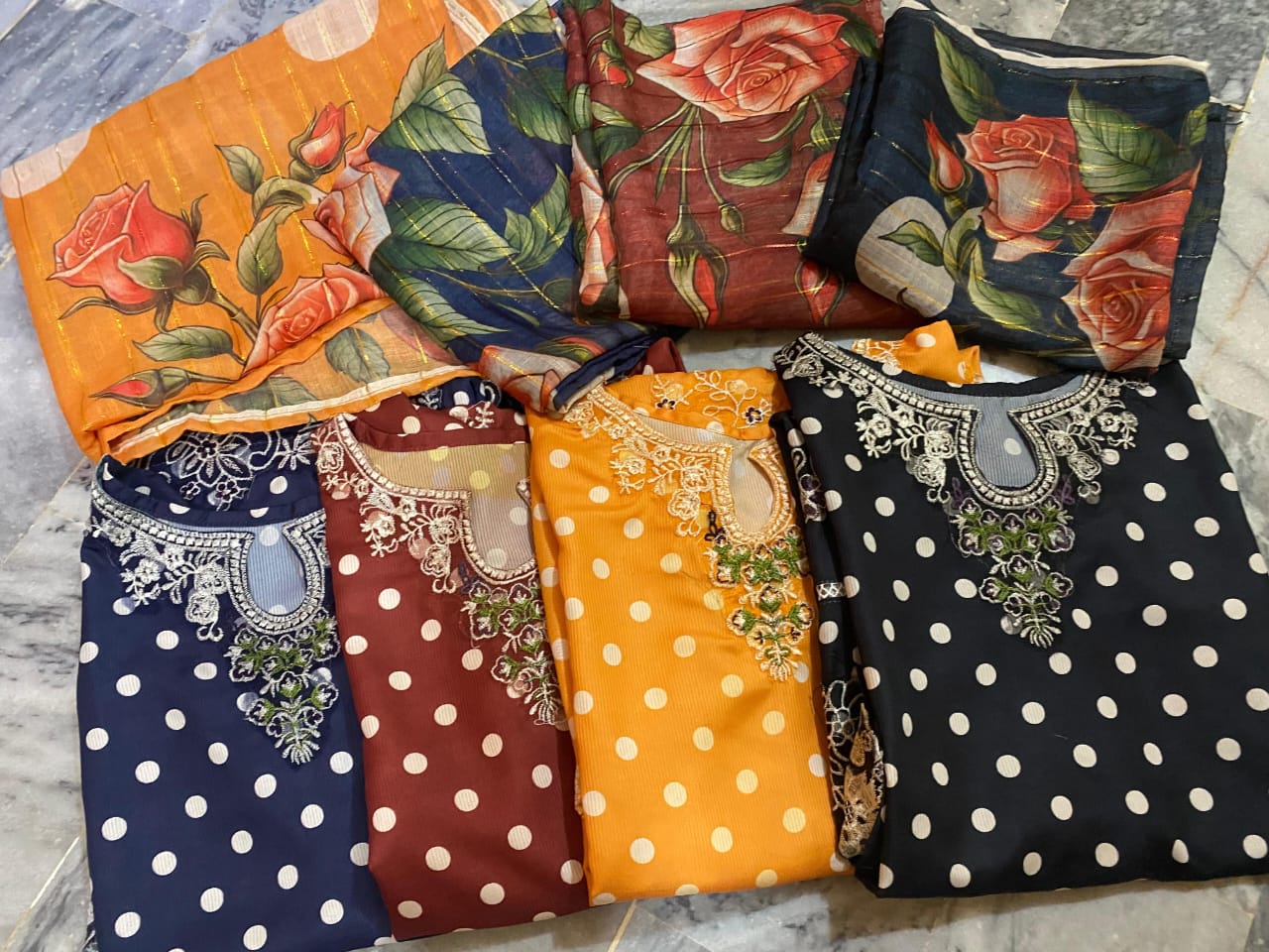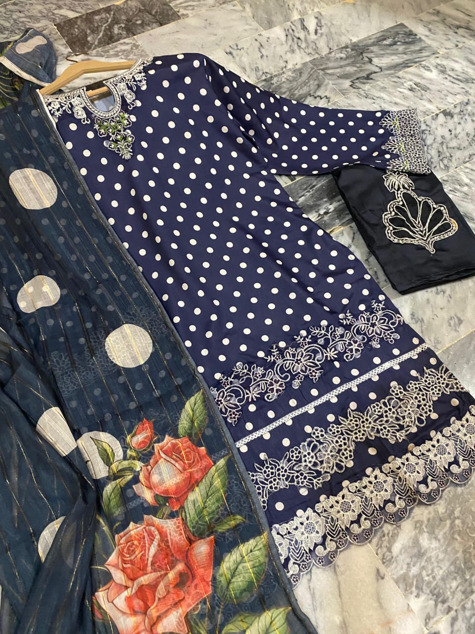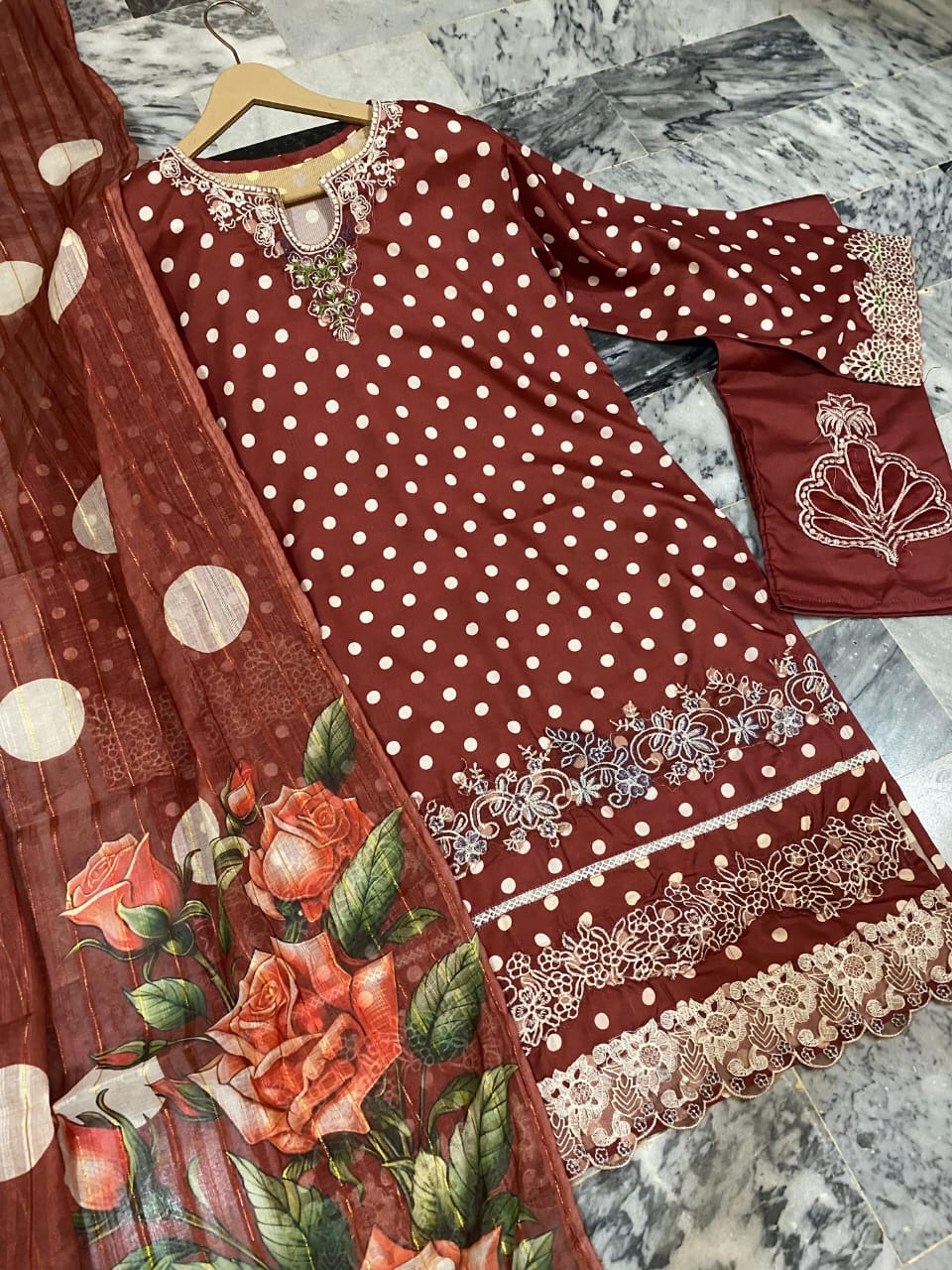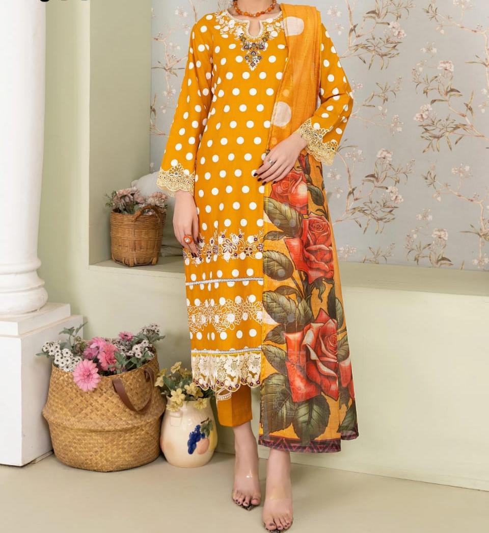 Polka Printed With Embroidered Patch On Neck,Border Shirt With Patch Emb Trouser And Printed monar Lawn Duppatta 3Pcs