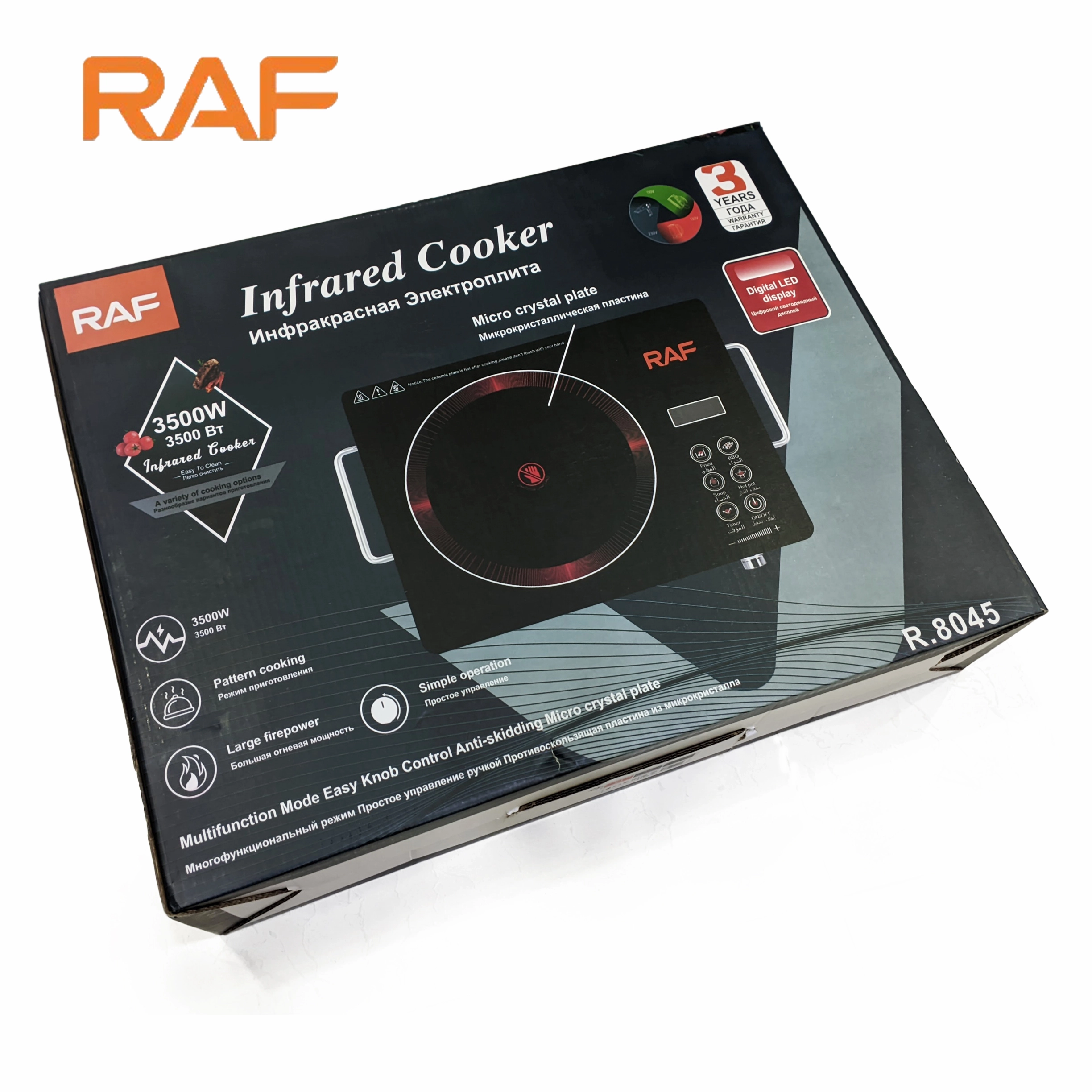 Experience unparalleled cooking performance with the RAF 3500W Infrared Cooker. Featuring large fire power for rapid heating and precise temperature control, this sleek cooktop is perfect for preparing all your favorite meals with speed and efficiency. Its modern design and robust construction ensure durability and ease of use in any kitchen.